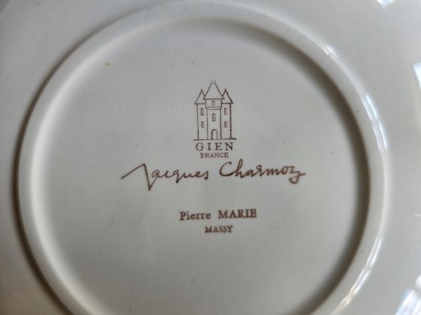 Voici une petite assiette à fromage ou à dessert issue d’un service de Gien qui a été très populaire dans les années 1950-60. Chaque assiette représente un véhicule ancien assorti d’une date. Les dessins sont signés Jacques Charmoz, un homme qui, certes, a vécu sa vie pied au plancher.
