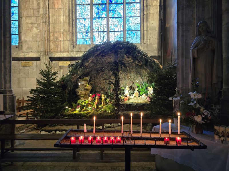 Dans la collégiale de Vernon, c’est un inhabituel bruit d’eau courante qui a attiré mon regard vers la crèche.