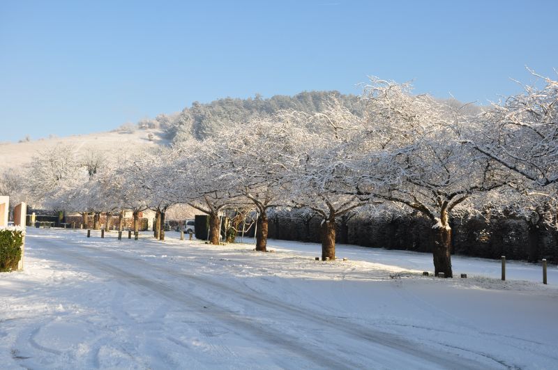 Pour Giverny où l’hiver est souvent plutôt doux, il est tombé une couche de neige assez conséquente : 5 centimètres peut-être. Assez pour métamorphoser le paysage, pas assez pour faire disparaître formes et couleurs. Voici le parking du Verger et ses cerisiers d’ornement, qui seront tout roses dans moins de trois mois.