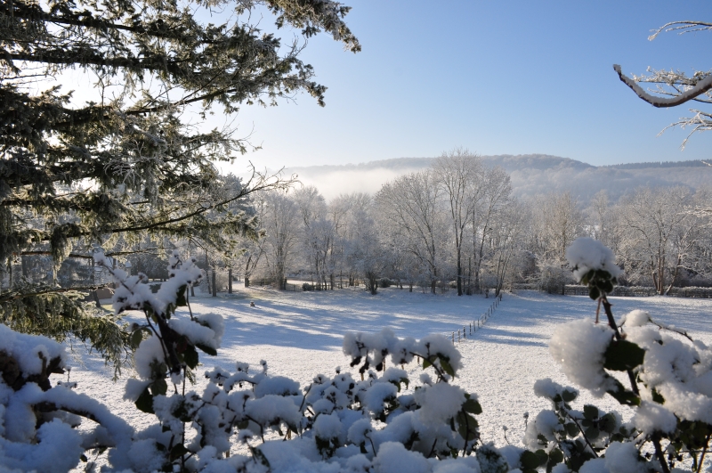 En face, le jardin de l’hôtel Baudy se devine plus enchanteur que jamais. Température à 11 heures du matin : – 6 °C.
