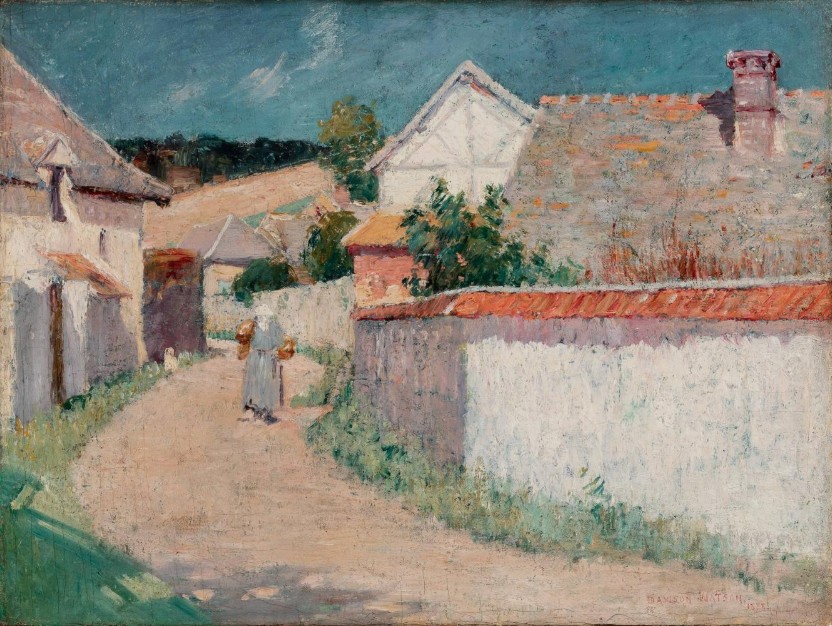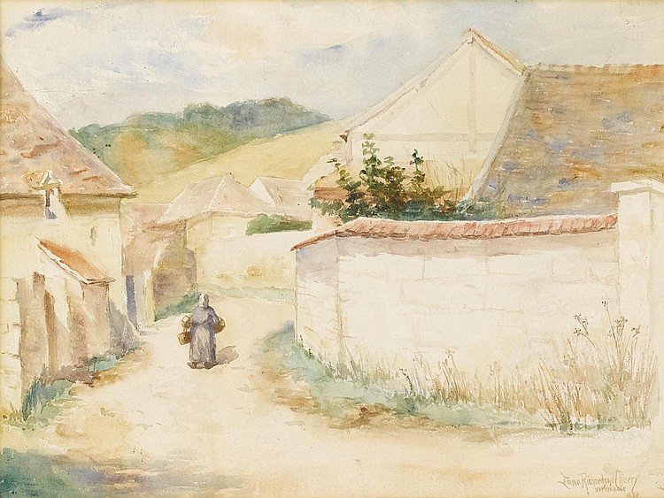 Cette jolie aquarelle est l’oeuvre d’une des premières artistes américaines à avoir séjourné à Giverny, Emma Richardson Cherry. Elle est signée, titrée Normandie et datée 1888 en bas à droite. Une paysanne chargée de paniers remonte la rue de la Côte dans un paysage baigné de lumière. On aperçoit au fond la ferme de la Côte et la colline qui domine le village.