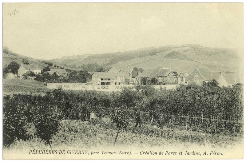 On le sait peu, mais Giverny disposait d’une florissante entreprise d’horticulture à l’époque de Claude Monet. C’est vers 1890 qu’Albert Féron s’installe dans le village et y fonde ses pépinières. Horticulteur, il est aussi paysagiste et travaille notamment pour la mairie de Giverny et pour l’hôtel Baudy, qu’on aperçoit à l’arrière-plan derrière le mur orné de la raison sociale de l’entreprise. Les terrains s’étendaient jusqu’à la ferme de la Dîme, qui faisait partie de la propriété des Féron. C’était leur résidence.
