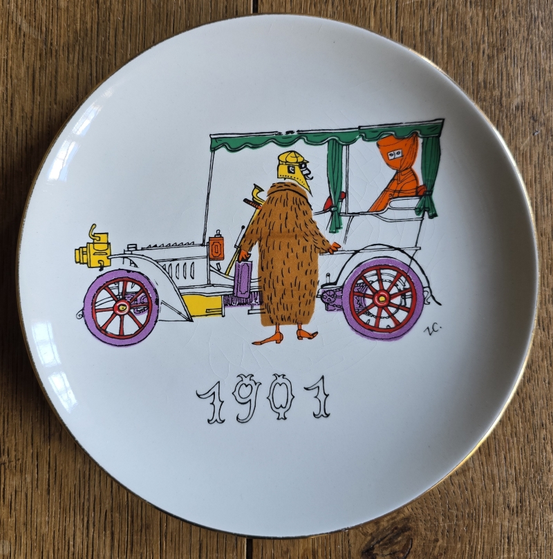 Voici une petite assiette à fromage ou à dessert issue d’un service de Gien qui a été très populaire dans les années 1950-60. Chaque assiette représente un véhicule ancien assorti d’une date. Les dessins sont signés Jacques Charmoz, un homme qui, certes, a vécu sa vie pied au plancher.