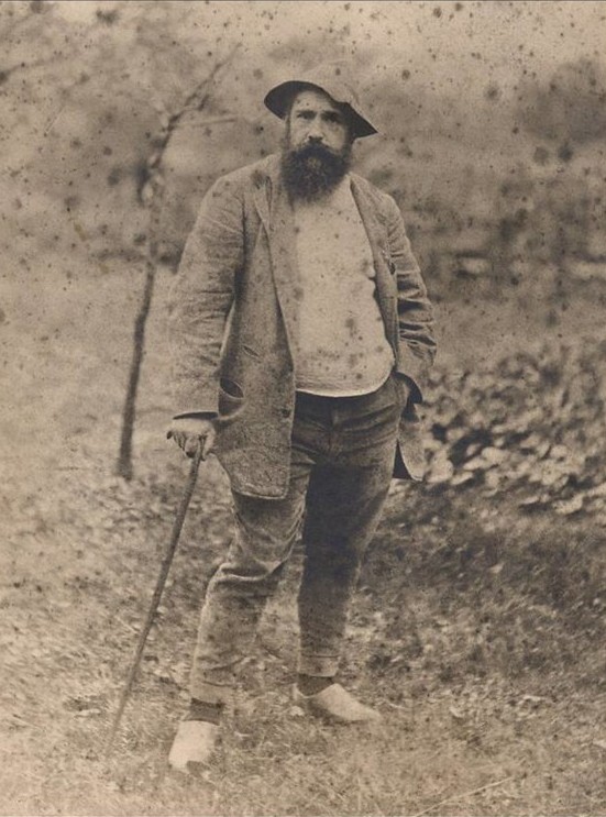 Sa tenue ne variait pour ainsi dire jamais. Coiffé d’un béret, chaussé de bottes de cuir ou de sabots. (Je précise de cuir parce que le mot botte fait maintenant penser exclusivement aux bottes de caoutchouc dont Monet n’aurait certainement pas voulu si elles eussent existé en son temps).
