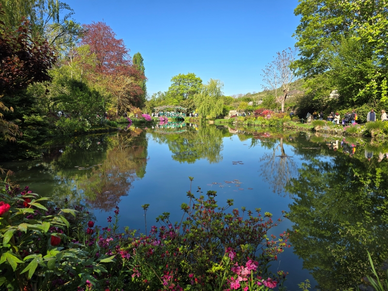 Ce matin à la première heure, avant l’arrivée des groupes, le jardin de Monet avait fière allure pour un 1er avril. L’azalée rose vif fait vibrer les verts à la sortie du souterrain.