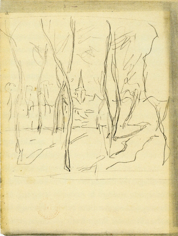 En voici une interprétation signée Theodore Butler. On retrouve la facture presque pointilliste déjà observée dans ses églises de Vernon, et la même disposition d’un bâtiment apparaissant derrière des feuillages.