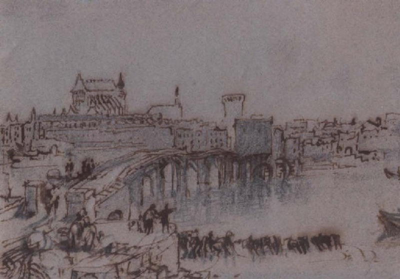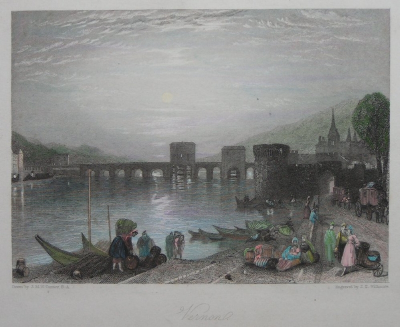 La Tate Gallery de Londres regorge d’oeuvres de William Turner, parmi lesquelles plusieurs vues de Vernon effectuées lors de ses voyages le long de la Seine vers 1827 – 1829. L’artiste remplissait ses carnets de croquis de paysages qu’il interprétait ensuite à l’aquarelle une fois de retour à l’atelier. Parfois, comme ici, on trouve deux dessins par page. Sur celui du haut on reconnaît le château des Tourelles à droite et la ville à gauche, un angle voisin de celui de la gravure de Pérelle, mais au ras de l’eau. En bas, l’angle est inversé. La ville est à droite. Au premier plan, le port de la place Chantereine, au centre du dessin, deux des importants moulins à blé qui tiraient parti de la force motrice de l’eau. Le pont apparaît très endommagé.