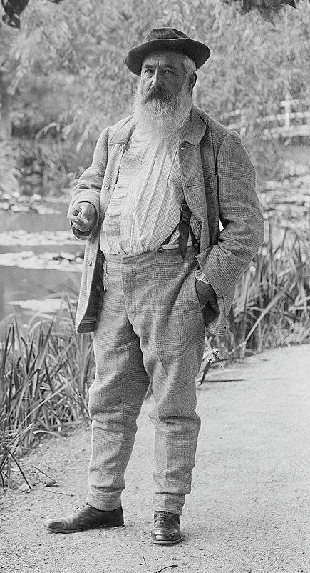 J’ai guidé cette semaine des personnes venues assister à la Paris Fashion Week, ce qui m’a donné l’occasion pour une fois de parler des goûts vestimentaires de Monet. Cette photo prise par Jacques Ernest Bulloz en 1905 est l’un des meilleurs exemples du raffinement recherché par le peintre. Une fashion victim à sa manière ! Elégant costume deux pièces, pantalon retenu par de solides bretelles de cuir fièrement arborées, chemise à plis ornée d’un volant et de poignets froncés, pantalon resserré à la cheville par quatre boutons, belles chaussures de cuir, chapeau, barbe ronde et cigarette à la main… Il y a un look Monet, qu’il s’est forgé sans se préoccuper des règles, comme toujours.