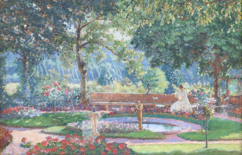 S’il n’était pas pensable pour une femme d’aller peindre seule dans la campagne à la fin du XIXe siècle, rien ne l’empêchait de représenter son jardin. A Giverny, Mary et Frederick MacMonnies en avaient un somptueux, à un kilomètre environ de celui de Monet, en direction de Vernon. La statue de Pan au milieu du bassin tout rond permet de l’identifier.