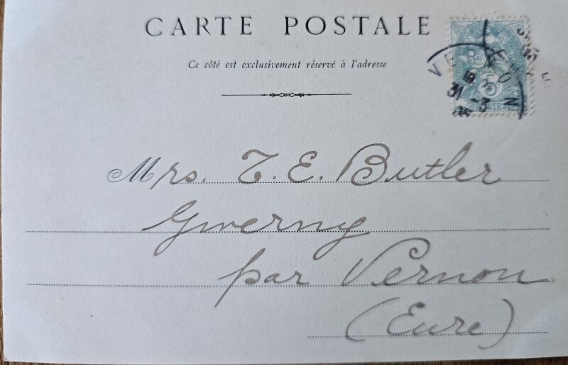 Cette carte est adressée à Mrs. (et non Madame) T. E. Butler, à Giverny, et pour que l’adresse soit complète l’expéditeur a rajouté par Vernon (Eure), informations dont le postier local n’avait guère besoin. L’écriture de ces lignes est très soignée, presque calligraphiée. En 1905, l’épouse de Theodore Butler est Marthe Hoschedé depuis plusieurs années.